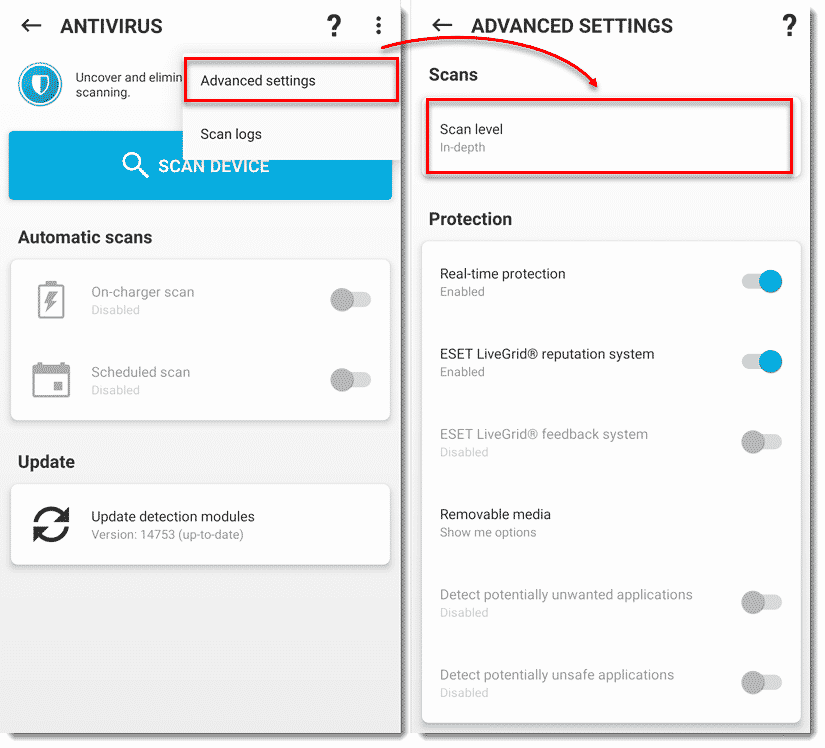 برای انتخاب سطح اسکن مورد نظر خود ، روی Advanced settings → Scan level → نماد سه خط تیره ضربه بزنید :
