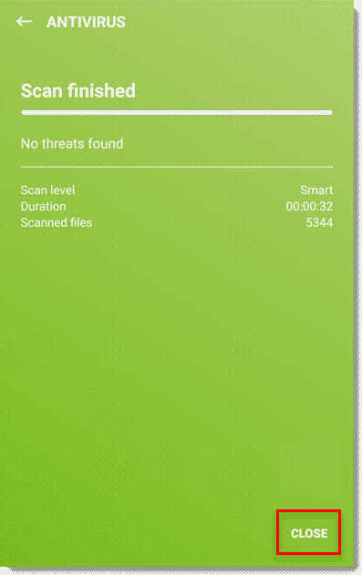 وقتی اسکن کامل شد ، سطح اسکن ، مدت زمان و تعداد فایل های اسکن شده ، آلوده ، پاک شده و قرنطینه شده نمایش داده می شود. برای پایان دادن به ، روی Close ضربه بزنید .
