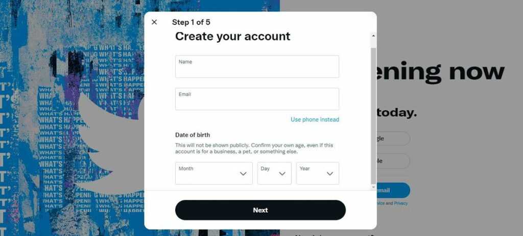 برای ایجاد حساب توییتر می توانید از شماره تلفن یا ایمیل استفاده کنید. همچنین امکان ایجاد حساب کاربری با استفاده از حساب کاربری گوگل و اپل آیدی وجود دارد. پس به وب سایت توییتر یا اپلیکیشن آن بروید و با استفاده از موارد بالا و البته انتخاب نام و تاریخ تولد خود یک حساب کاربری ایجاد کنید.